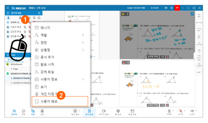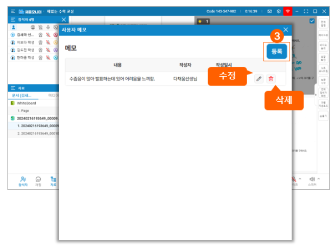수업 중 발견한 학생별 특성, 행동 관찰, 학습 진행 상황을 생활기록부처럼 메모에 기록할 수 있어요.메모 이력은 누적되어 같은 정규수업으로 재입장 시 기존 이력을 불러올 수 있습니다.