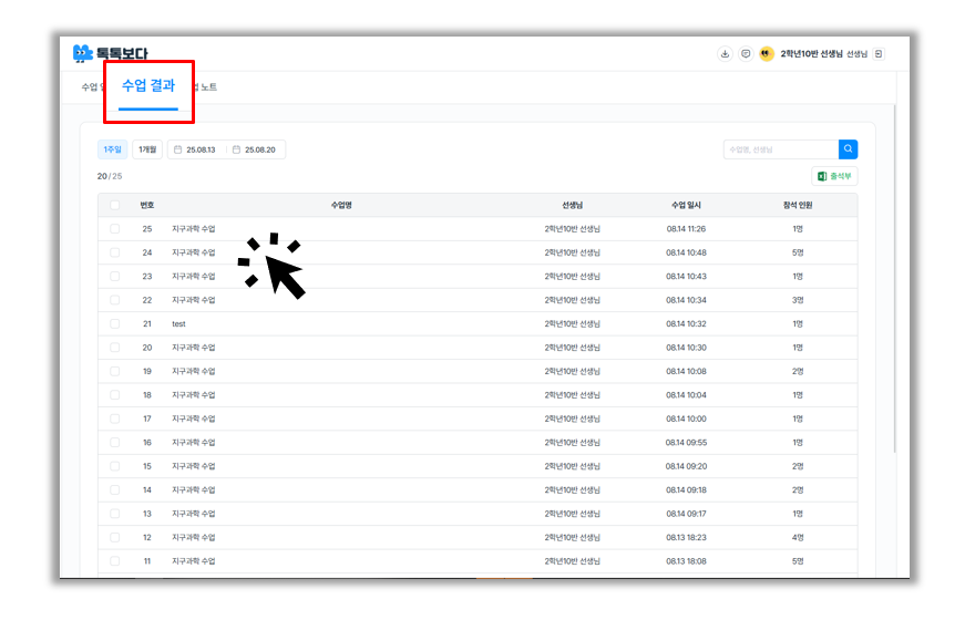 1. 톡톡보다 웹페이지에서 [수업 결과] 메뉴 클릭