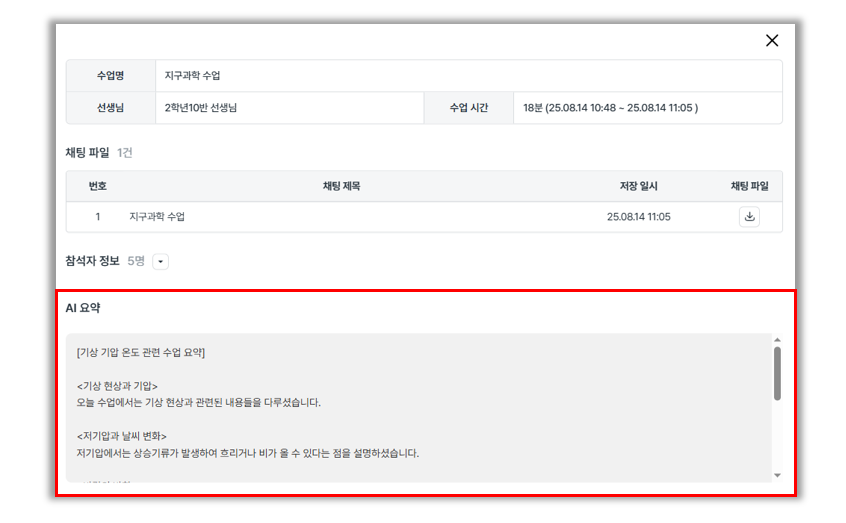 수업 종료 후엔 웹페이지에서 요약본을 확인할 수 있어, 수업 내용을 다시 복습하거나 선생님 학습 및 보고 자료에 활용 가능해요.